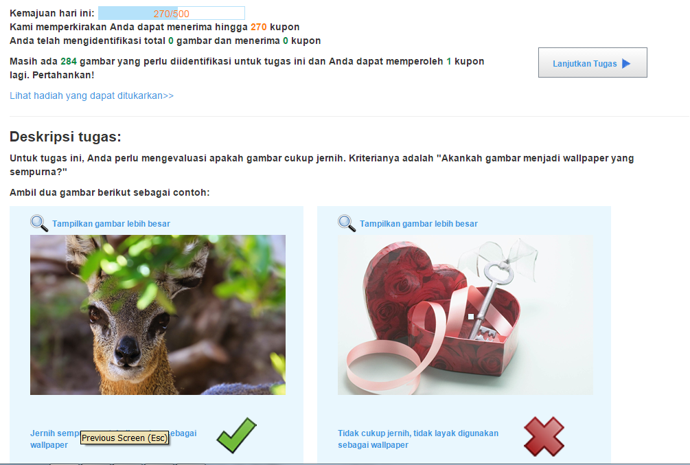Ketetntuan : "Menangkan 1 kupon hadiah untuk setiap gambar yang dievaluasi — tidak ada hadiah untuk evaluasi yang tidak akurat. Jika evaluasi Anda akurat, kami akan mengirimkan kupon hadiah kepada Anda pada hari berikutnya."