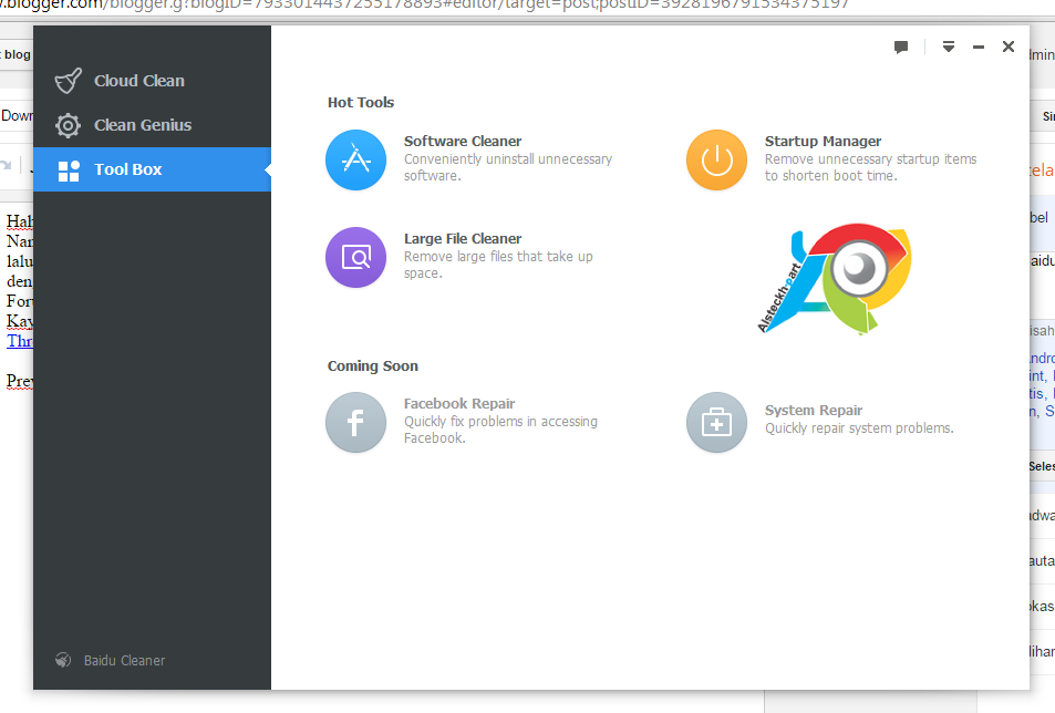 Hahaha, mimin AlsteckhPart datang lagi nih. Dan kali ini mimin bagi software Cleaner Terbaru. Namanya adalah Baidu Cleaner (Ultra-Clean Cloud Technology for PC). Sebenarnya mimin udah tahu software ini sekitar seminggu yang lalu. :D Namun baru hari kemarin mimin sempat download dan instal. Software ini hampir sama sih dengan CCleaner, fungsingya juga sama . Hehehe.... Sekedar info, Baidu Cleaner